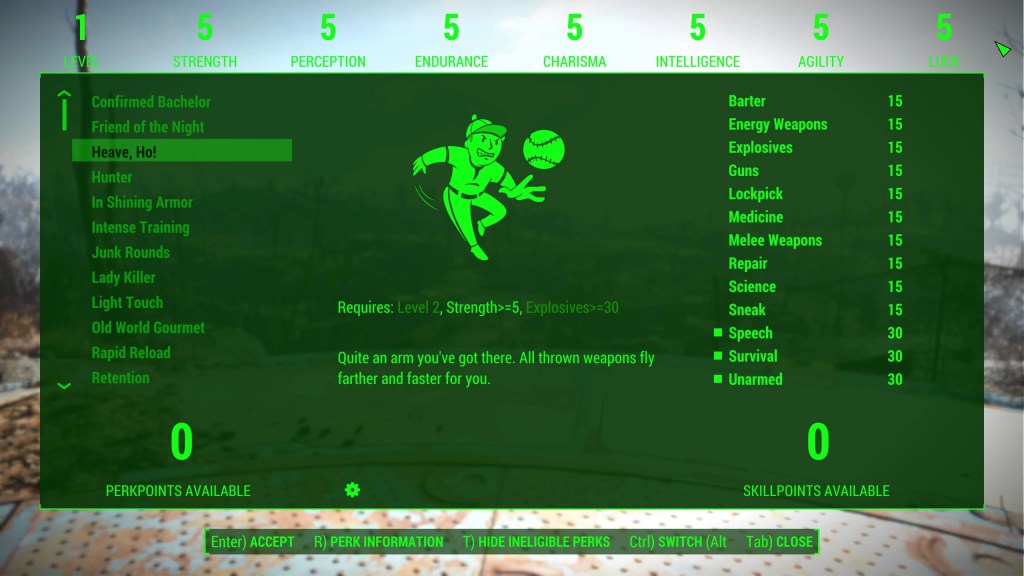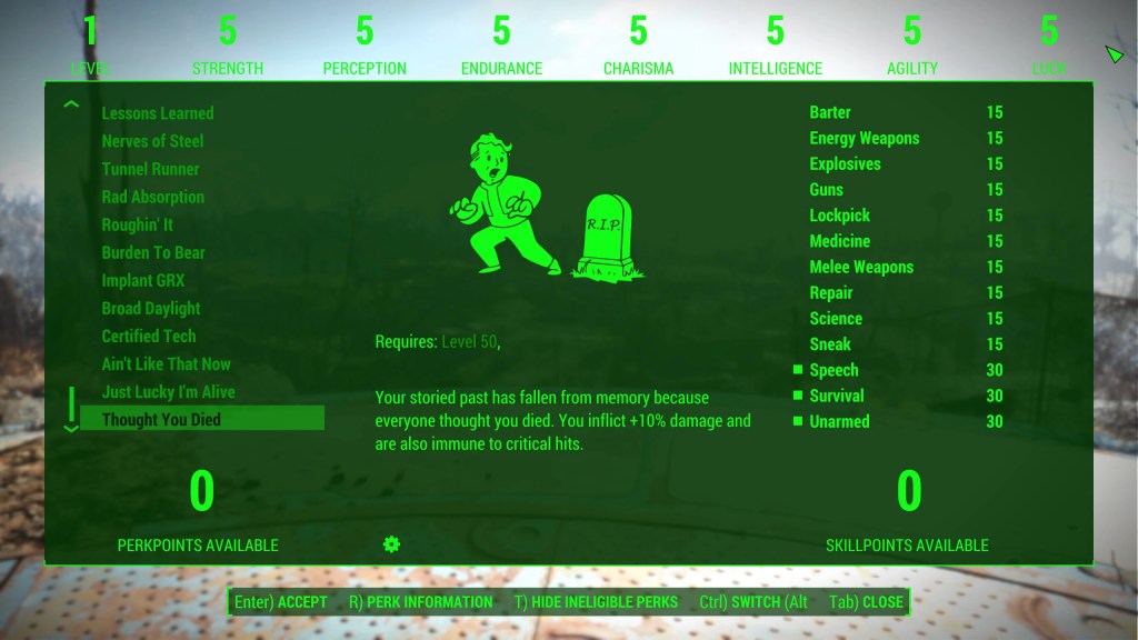 Enjoy all 13 skills from New Vegas in Fallout 4, along with its leveling mechanics, and all 117 regular perks and 16 traits. Every perk and trait has a gameplay function* and has an icon with it**