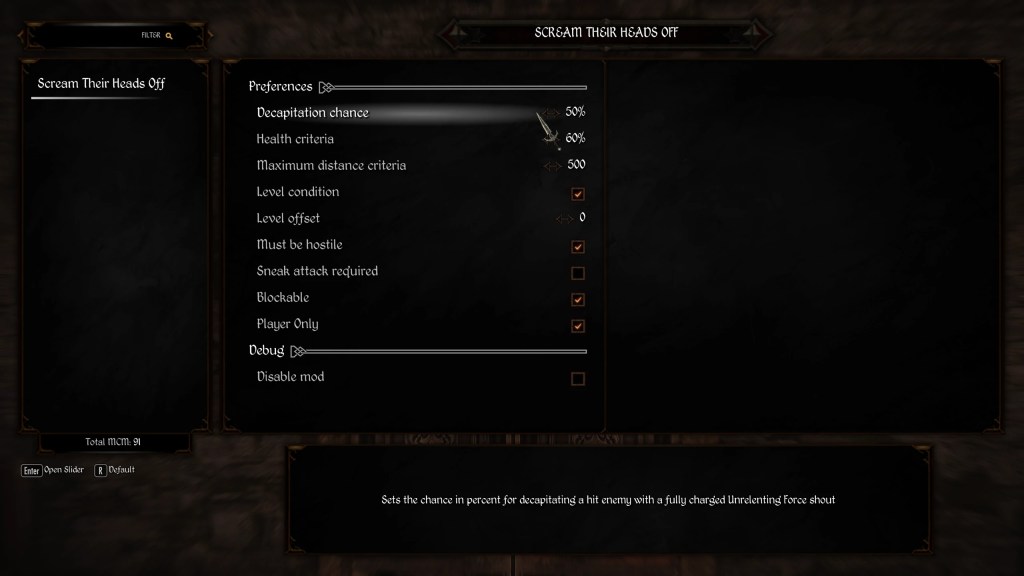 The mod is fully configurable in the mod menu. The conditions for decapitation can depend on the enemy NPC health, level compared to the player, distance from the player, random chance, and more (such as requiring a sneak attack, allowing the NPC to block the attack, etc.).