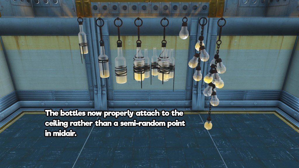 - Fixes the placement markers on the hanging bottles so that you can properly attach them to the ceiling rather than leaving them floating in midair. (Existing object placement will be untouched, so your current settlements are safe!)